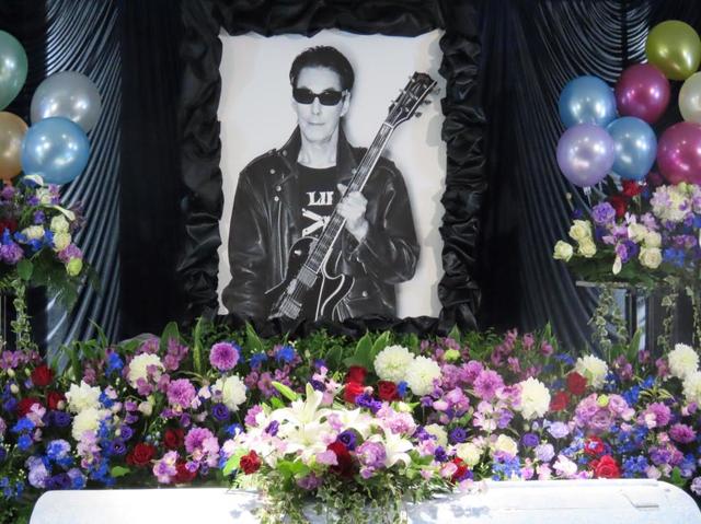 祭壇はバルーンやダリアやバラなどの花で埋め尽くされ、ステージ衣装や愛用したギター8台、レコード15枚などゆかりの品で飾られた。遺影は、14年リリースのアルバム「ロケットライド」の際に撮影したもので、娘3人で話し合って決めたという。