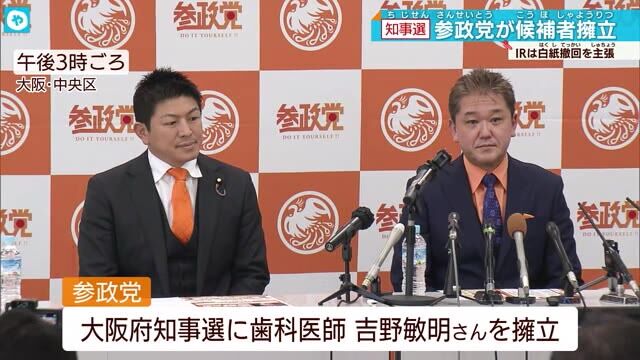 参政党 吉野敏明氏 大阪府知事選への出馬を表明「大阪から日本を取り戻す」 2023年02月26日 カテゴリ:政治 大阪府知事選に参政党が公認候補を擁立 都道府県知事選で初 出馬表明は4人に (出典:関西テレビ) (出典 cdn.tv-osaka.co.jp) (出典 【速報】参政党 吉野敏明氏 大阪府知事選への出馬を表明「大阪から日本を取り戻す」 [509689741])1 クトノモナス(兵庫県) [GB] :2023/02/24(金) 17:34:49.47ID:ynYxJ1130● 「大阪から日本を取り戻す」参政党の吉野敏明氏 大阪知事選出馬表明 任期満了に伴う大阪府知事選(4月9日投開票)で、参政党は24日、歯科医師の吉野敏明氏(55)を公認候補として擁立すると発表した。知事選への出馬表明は4人目。 吉野氏は大阪市内で記者会見し、「大阪維新の会が大阪から日本を変えると宣言して13年。大阪が本当に良くなったのか。苦しんでいる人がたくさんいる。大阪から日本を取り戻すというスローガンでまい進したい」と述べた。府市が誘致を進めているカジノを含む統合型リゾート(IR)は、当選すれば白紙撤回する方針だ。 吉野氏は2022年参院選に参政党から比例代表で出馬したが落選した。参政党が都道府県知事選に候補を擁立するのは初めて。 https://mainichi.jp/articles/20230224/k00/00m/010/143000c (出典 【速報】参政党 吉野敏明氏 大阪府知事選への出馬を表明「大阪から日本を取り戻す」 [509689741]) 【参政党 吉野敏明氏 大阪府知事選への出馬を表明「大阪から日本を取り戻す」】の続きを読む