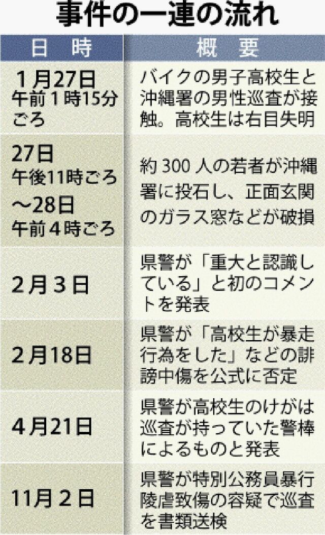 事件後には沖縄署に数百人の若者らが集まり、一部が投石するなど騒動が起きた。暴力団構成員の男(22)=公判中=が暴力行為法違反(集団的器物損壊)の罪で逮捕・起訴されるなど少年ら計15人が摘発された。