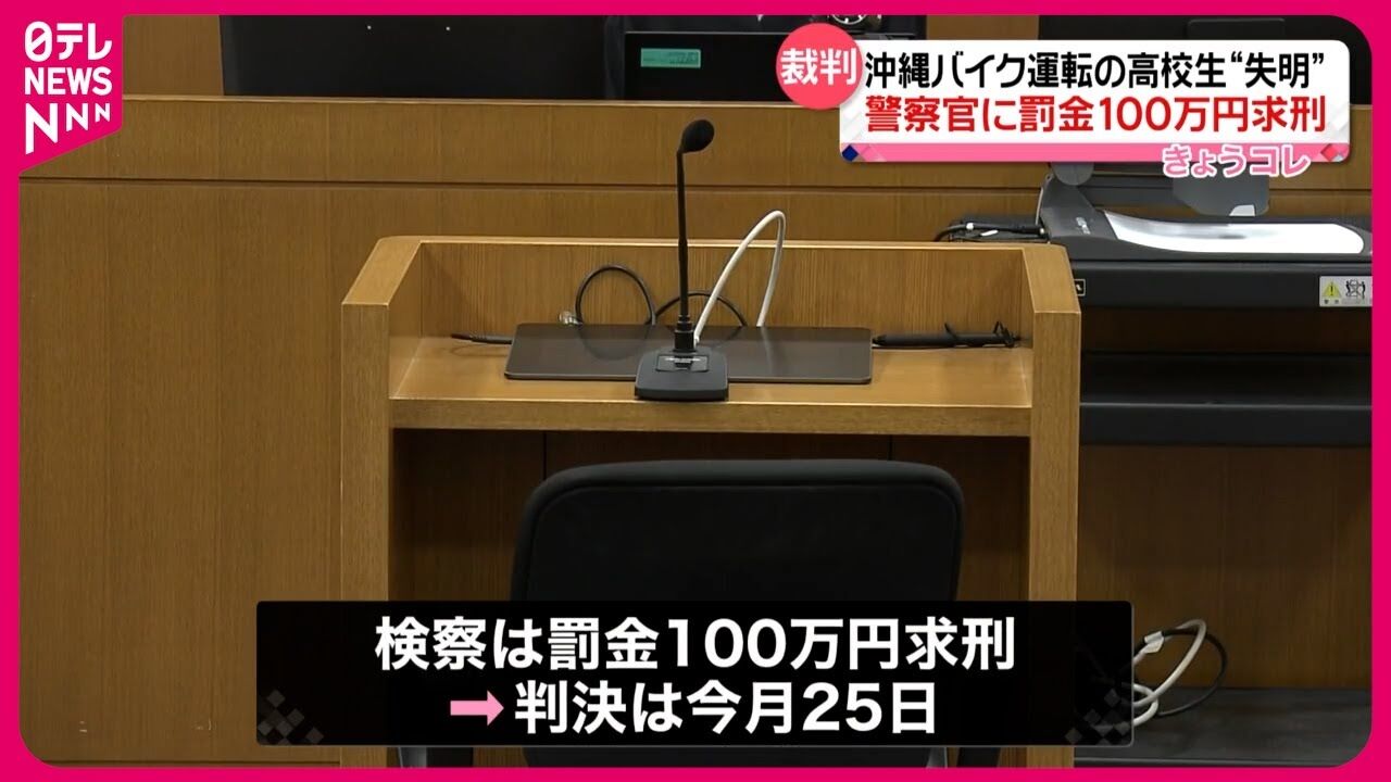 沖縄市で昨年1月、高校生だった男性(18)のバイクを止めようとして警棒が接触し右目を失明させたとして、業務上過失傷害罪に問われた当時沖縄署勤務の巡査で宮崎県警の警察官の被告(31)の初公判が4日、那覇地裁(佐藤哲郎裁判長)であり、被告は起訴内容を大筋で認めた。検察側は罰金100万円を求刑し、弁護側は罰金刑を求め即日結審した。判決は25日。