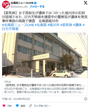 遺体が見つかった現場から約10キロ離れた場所では、SNSトラブルが原因で留萌市の女子高校生が橋から落とされ殺害される事件が起きていて、遺体は石狩川の下流で発見されています。