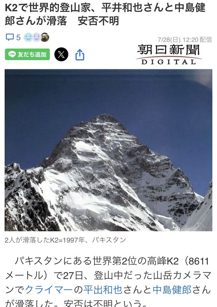 | 「イッテQ」でも人気の登山家らがK2で滑落「無事でいてくれ」「最強レベルの人だったのに」衝撃広がる …所属の山岳カメラマンでクライマーの平出和也さん(45)=長野県出身=と中島健郎さん(39)=奈良県出身=が滑落したと明らかにした。安否は不明としている… (出典:スポニチアネックス) |