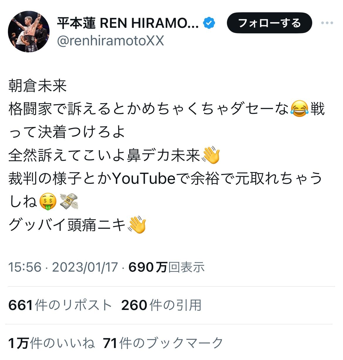 朝倉が平本への訴訟を匂わせたときは散々ダセえ言ってたのにな
