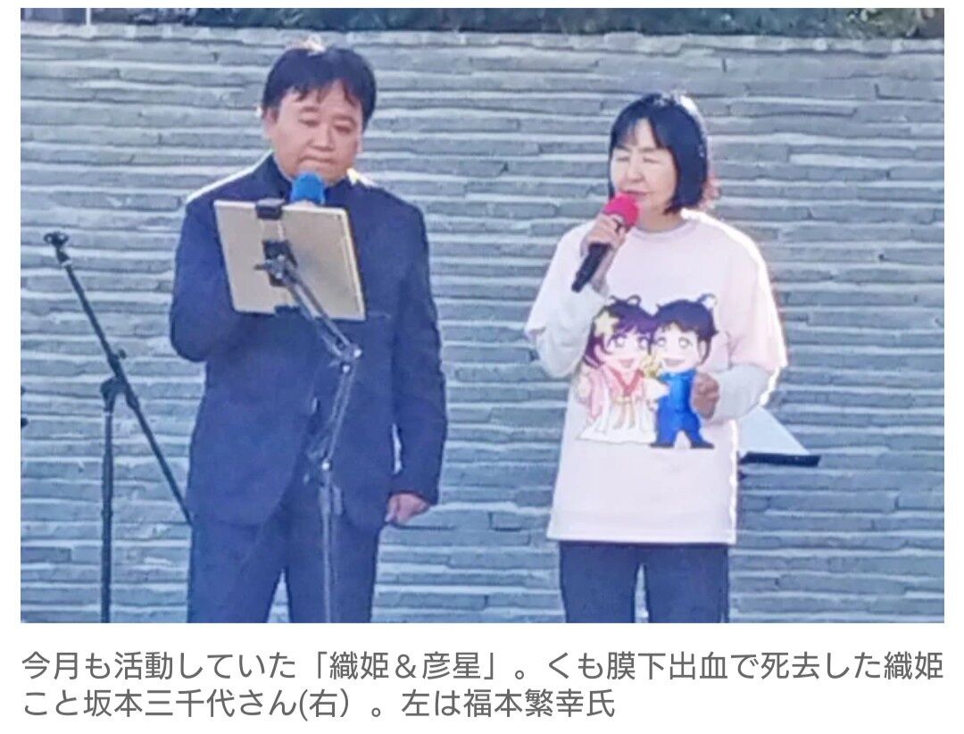 昨年の都知事選や兵庫県知事選に立候補したレコード会社社長の福本繁幸氏(58)が19日、「織姫&彦星」名義で、歌手として、コンビを組む織姫(本名・坂本三千代)さんが死去したことを明かした。61歳だった。