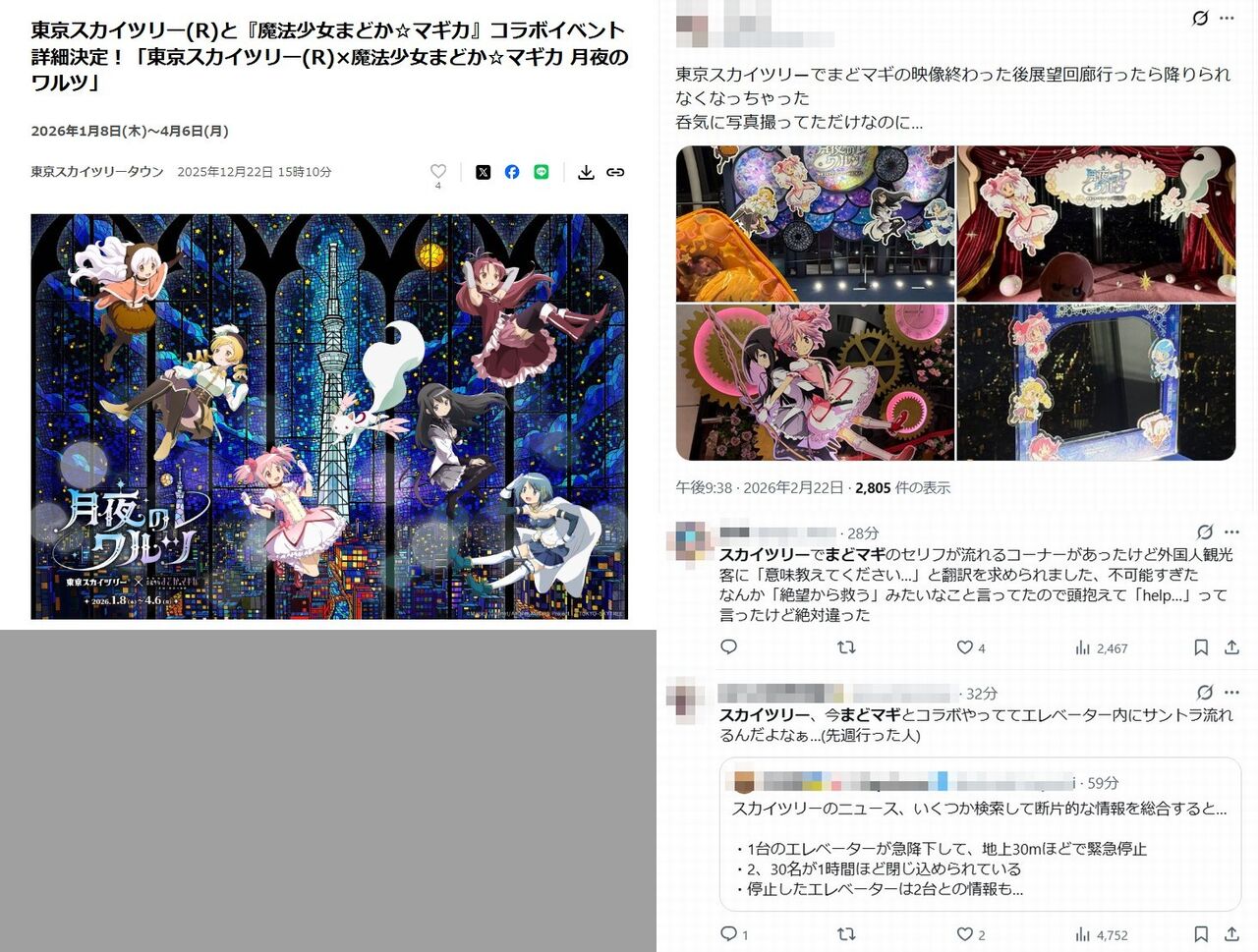 【速報】東京スカイツリーで閉じ込め続く エレベーター内に子ども2人含む男女22人