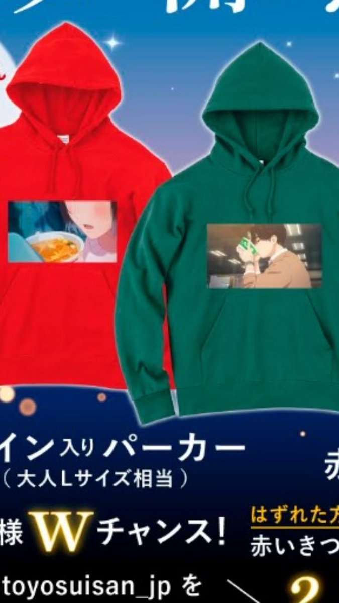 CMのひとコマを切り取ったイラストをプリントしたパーカーだが、『緑のたぬき』バージョンは男性キャラがスープを飲み干している全体像のイラストなのに対し、『赤いきつね』は女性キャラの口元だけのイラストとなっている。